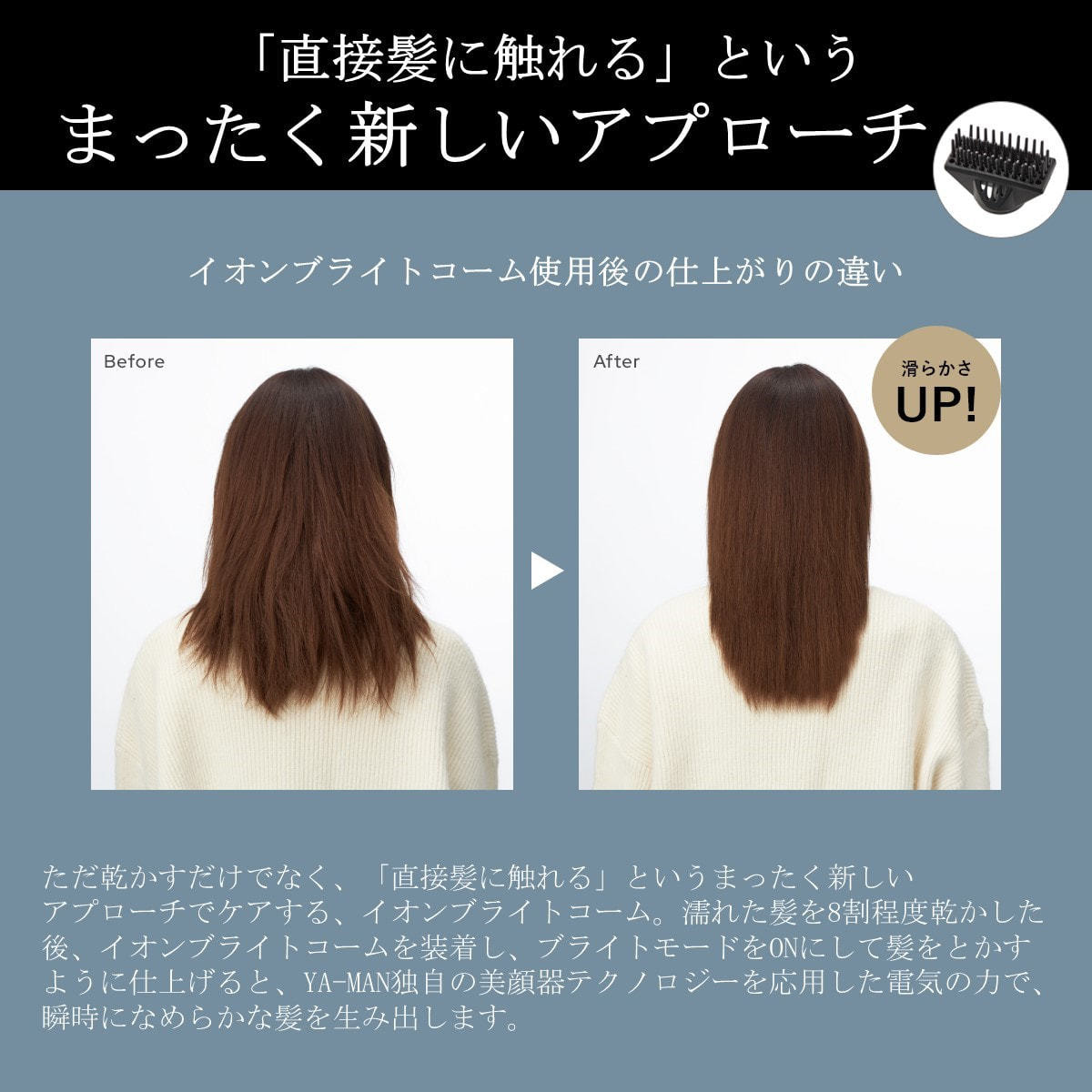 ただ乾かすだけでなく、「直接髪に触れる」というまったく新しいアプローチでケアする、イオンブライトコーム。濡れた髪を8割程度乾かした後、イオンブライトコームを装着し、ブライトモードをONにして髪をとかすように仕上げると、YA-MAN独自の美顔器テクノロジーを応用した電気の力で、瞬時になめらかな髪を生み出します。